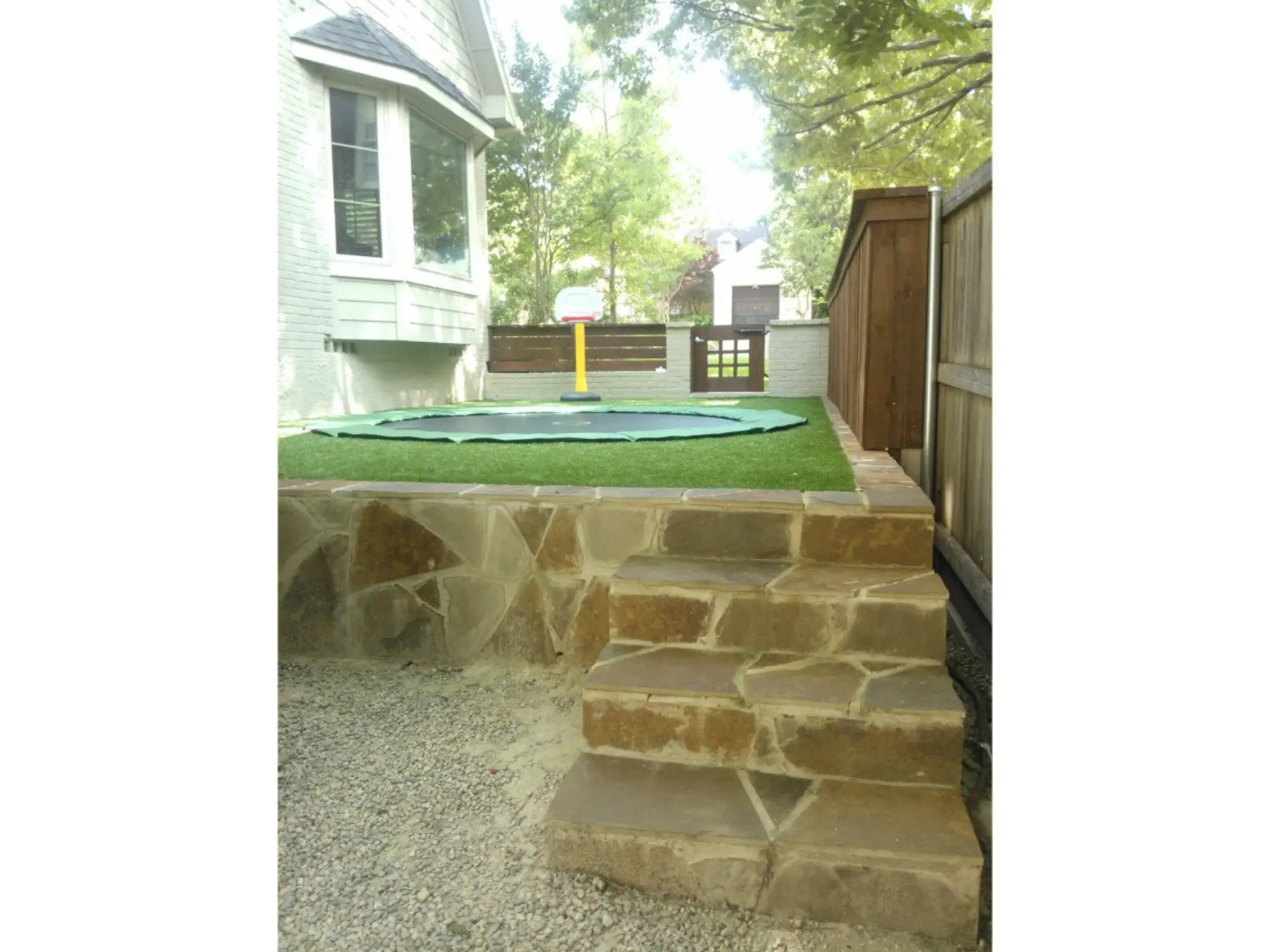 The sparse grass and exposed dirt made this side yard play area both an eyesore and a muddy mess. The homeowners dreamed of a space where their kids could play that was out of the way of their main backyard entertaining area, but that was still attractive and clean. To make the area more kid-friendly and easy to keep clean, we removed the old weak lawn and installed low-maintenance faux turf. While real grass is always our preferred choice, this area simply couldn’t sustain a healthy lawn, and water was being wasted trying to maintain it. This high-quality faux turf is soft to the touch, looks real and is easy to maintain. Just hose off any dirt or dust, the water runs through to the soil beneath because the backing material is permeable. Kids can play as much as they want with no worry about damaging the lawn. We also excavated part of the yard so that the kids trampoline could be installed at ground level. To make it easy for the kids to travel to their new playground, we installed attractive steps using natural stone pavers. The addition of a custom designed brick wall and rustic fence provides both safety for the kids and a big boost to the home’s curb appeal. Now, the homeowners have a special place for the kids to play that looks beautiful both from their home and the street.