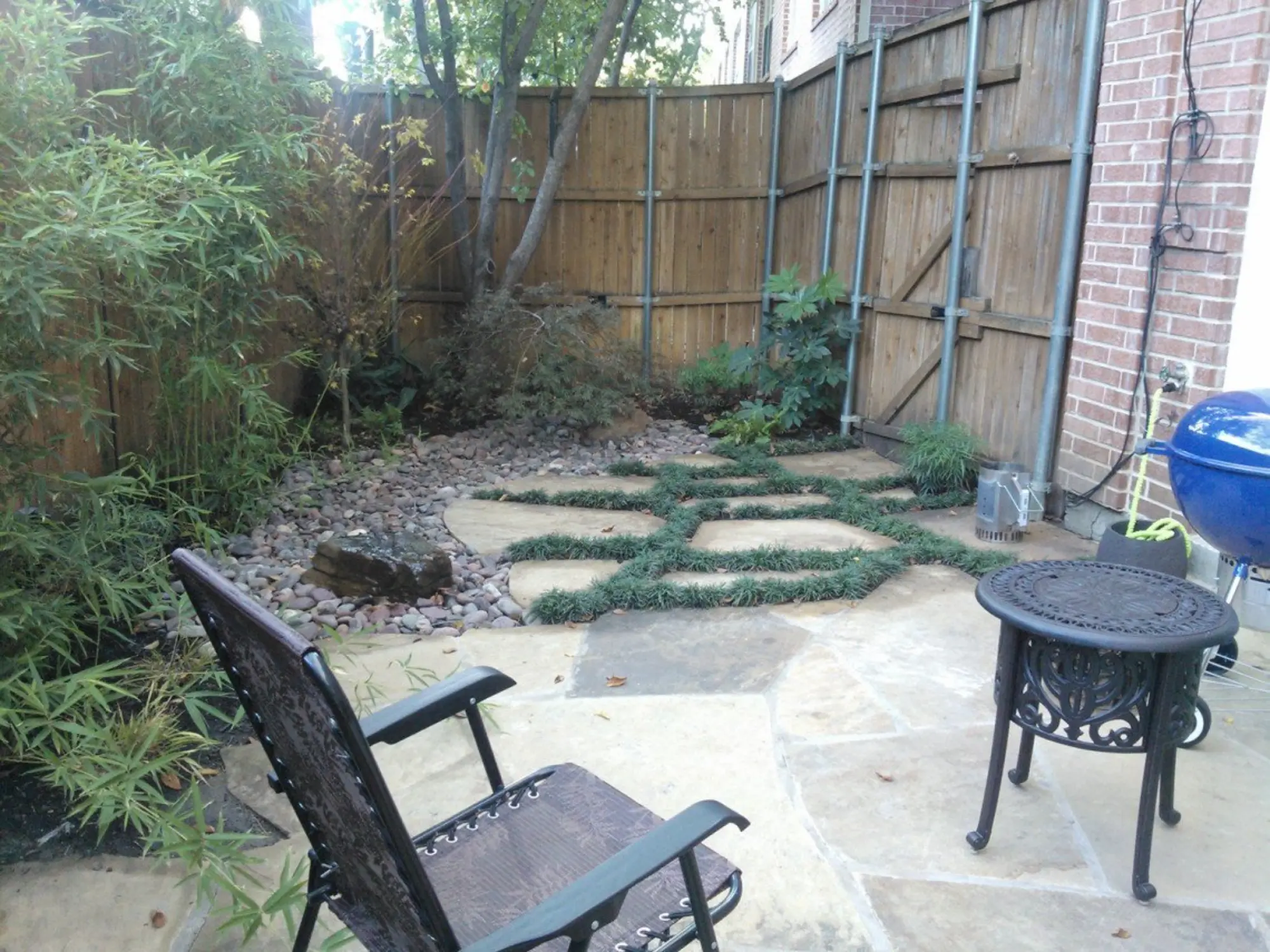 This cozy backyard patio proves that you don’t need a lot of space to make a big impact! We created a custom natural stone patio to make the small space more useable, then added plantings between the stones to soften up the look and feel of the space. Low-maintenance plantings were added to make the space more cozy and inviting. The softly bubbling boulder water feature is an added touch of calm.