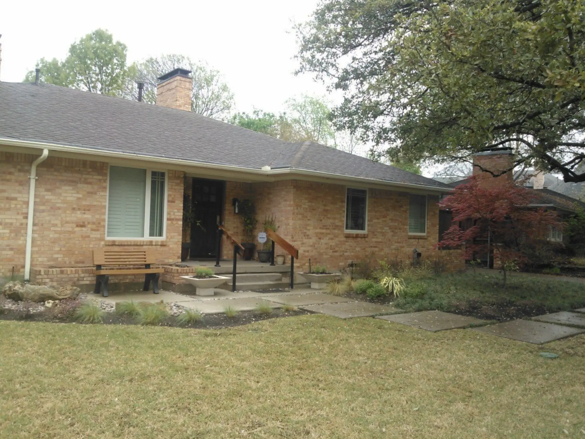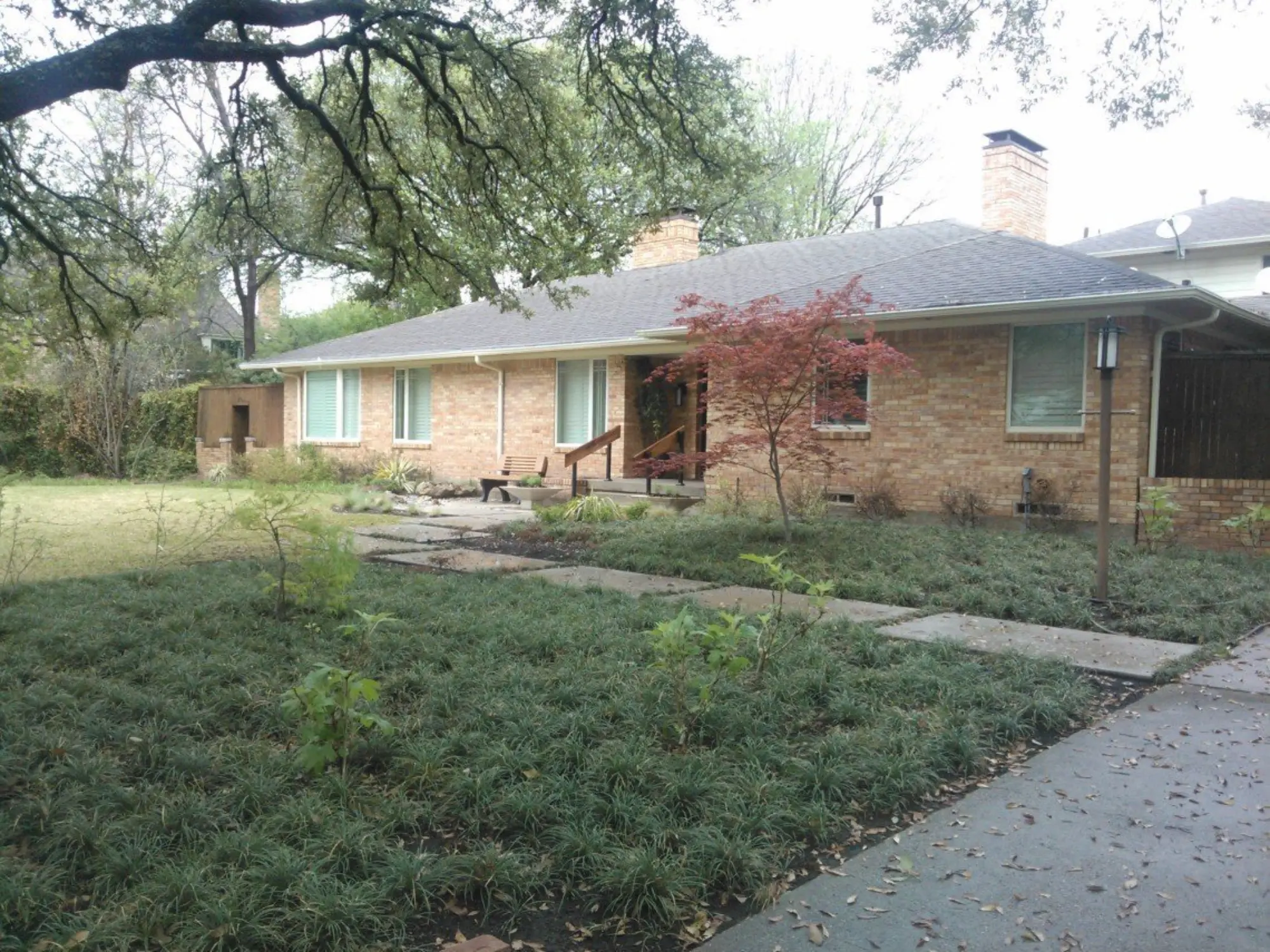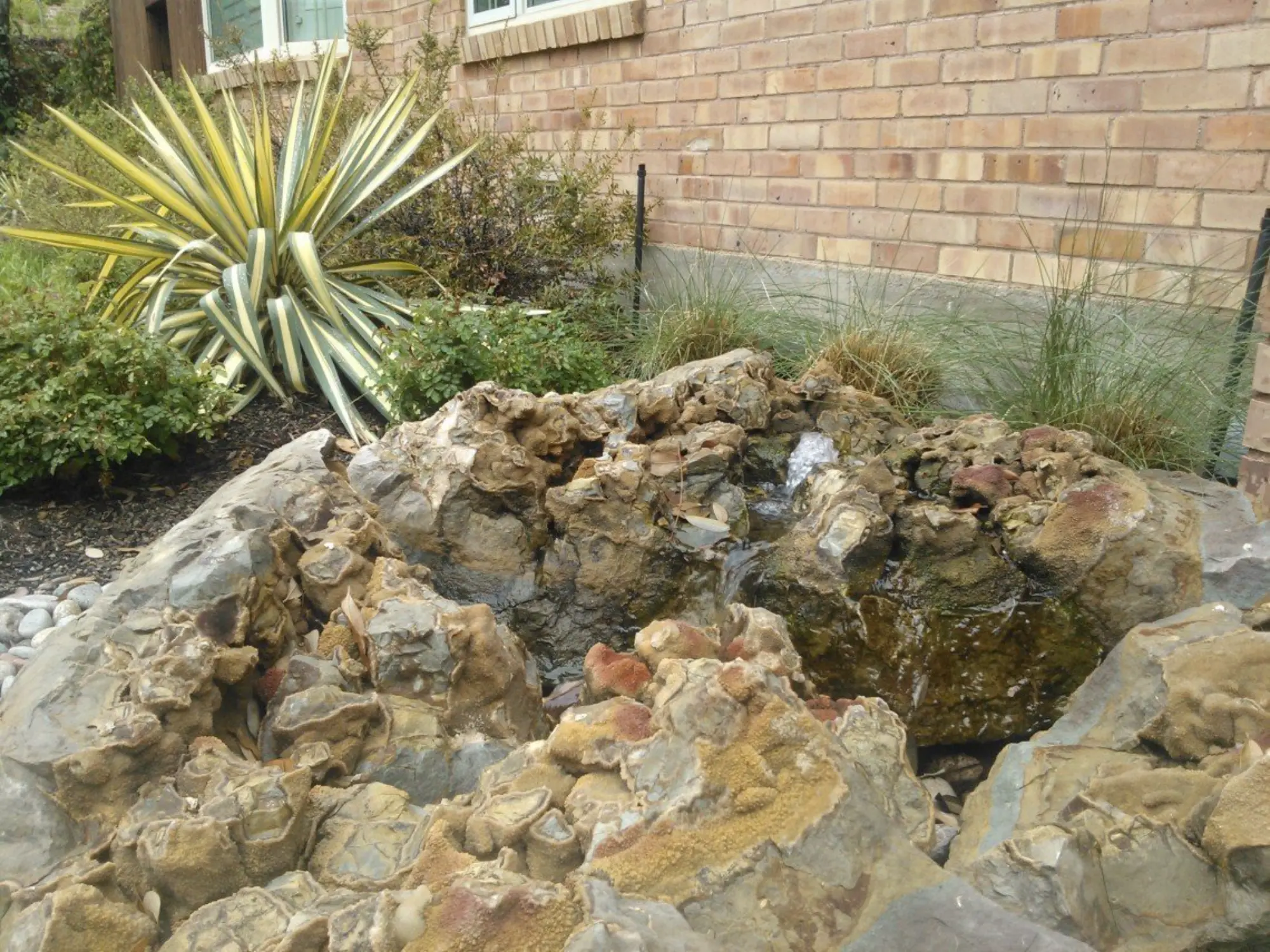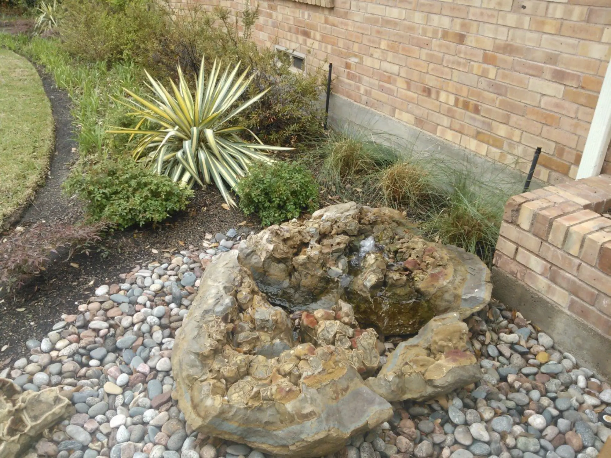 Stone slabs, river rock accents and waterwise plants make this new landscape easy to maintain and comfortable to live in. The front steps were widened and a wood handrail was added to tie in the wood of the bench in front. Dwarf mondo grass was planted under the large shade tree as an alternative to leaving the soil bare. This will cut down on erosion. River rocks help with drainage and are a beautiful design element. A boulder water feature evokes calm to arriving guests.