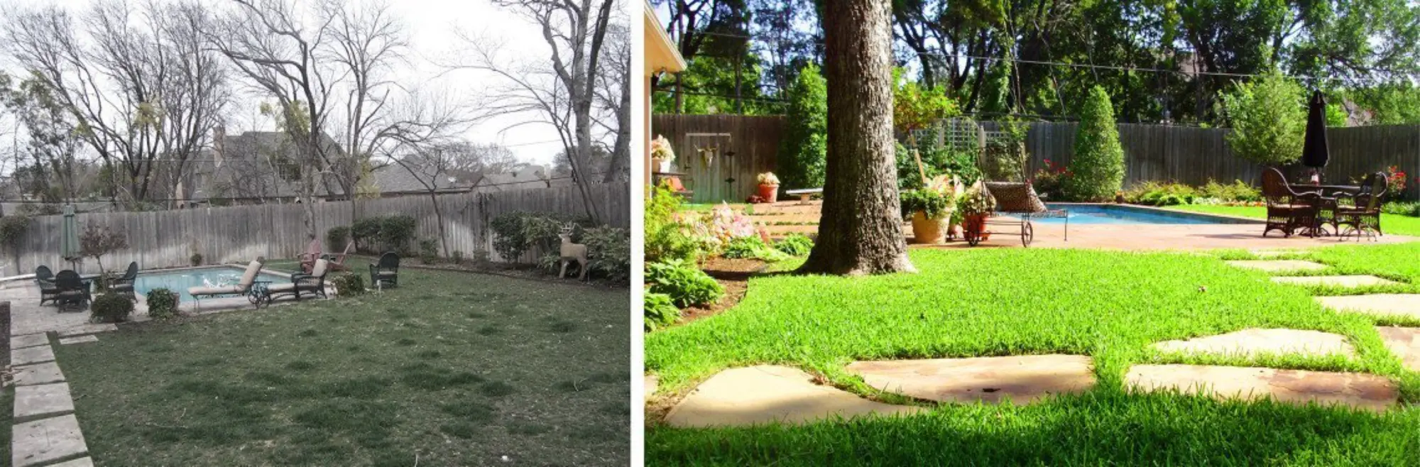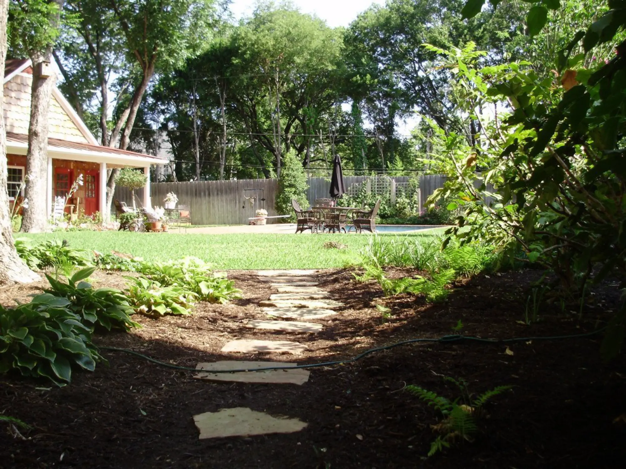 The southern style columns and red brick edging along the front pathway make for an inviting walk-up to this comfortable and traditional home. Symmetrical plantings of seasonal color are updated throughout the year keep the front landscape, and curb appeal, fresh. Containers filled with coordinating plants are a welcome surprise as guests reach the front door. The backyard, as you can see from the image in the gallery, was in need of a refresh. We improved the health of the grass so it was healthy and beautiful and then added stone pathways leading around the pool. We complemented the backyard with landscape plantings of hostas and ferns in the shady spots and roses and evergreens along the sunny fence line.