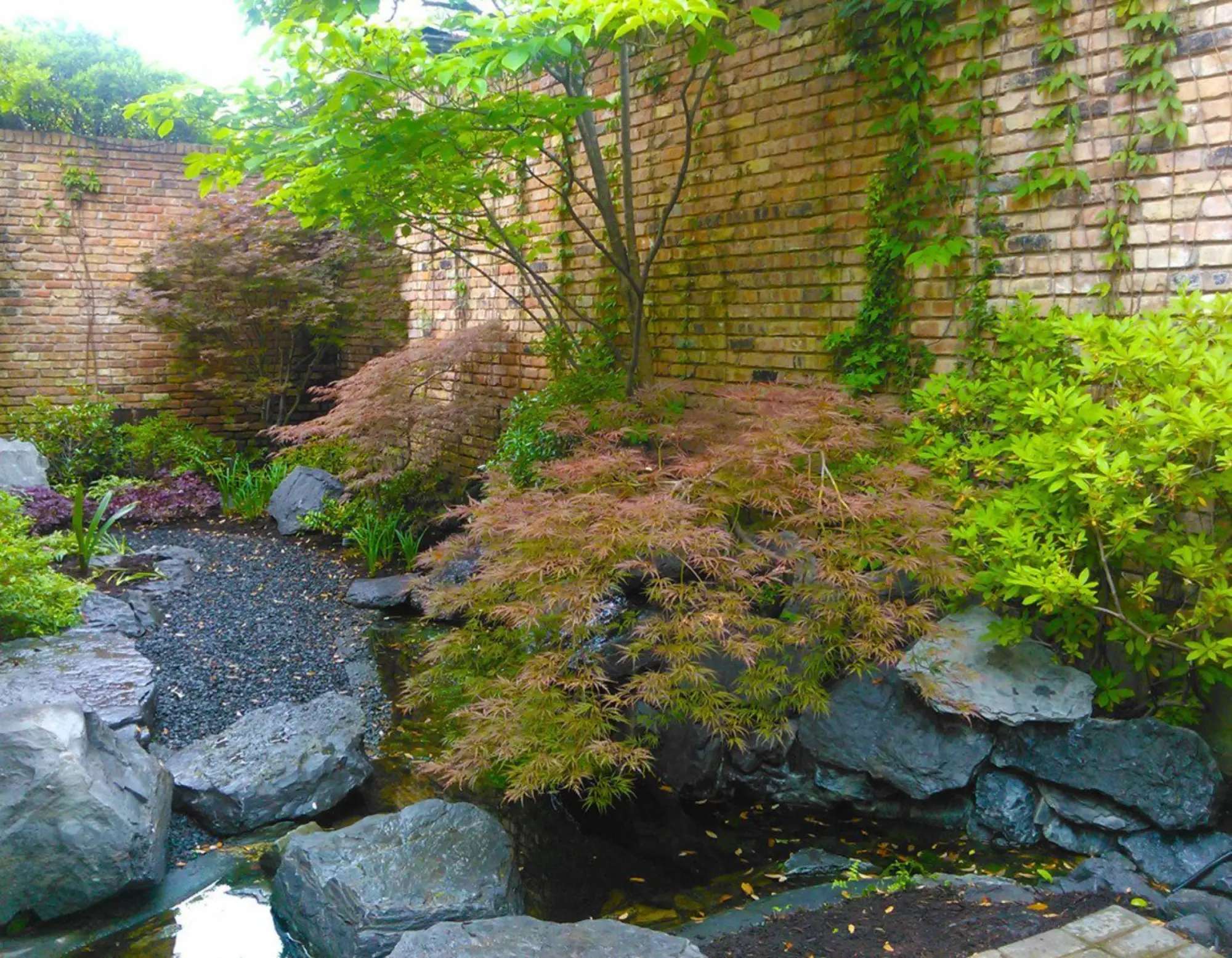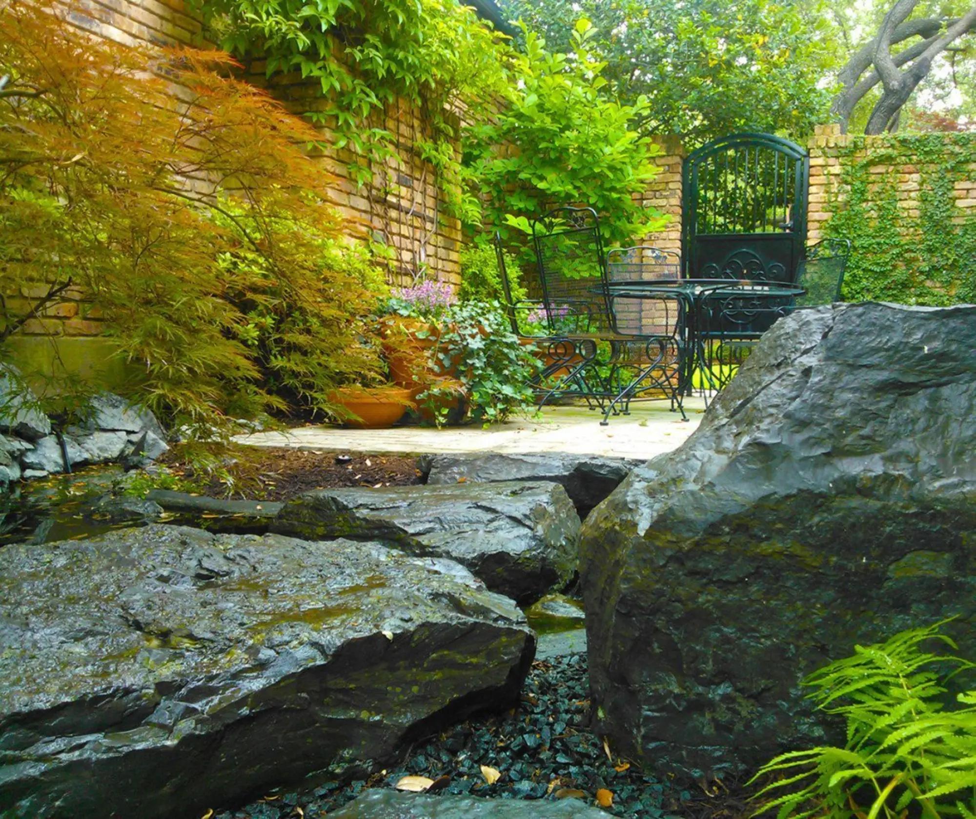 Bring a bit of Japan to your home with the bright foliage and architectural shapes of Japanese maples, a serene water feature and the soothing neutral colors of gray and black stones. We turned this small patio into a zen oasis by carefully choosing plants that offered both color and texture for seasonal and year-round interest, then combined them with carefully placed, large boulders and a bubbling waterfall. Keep calm in your urban backyard getaway!