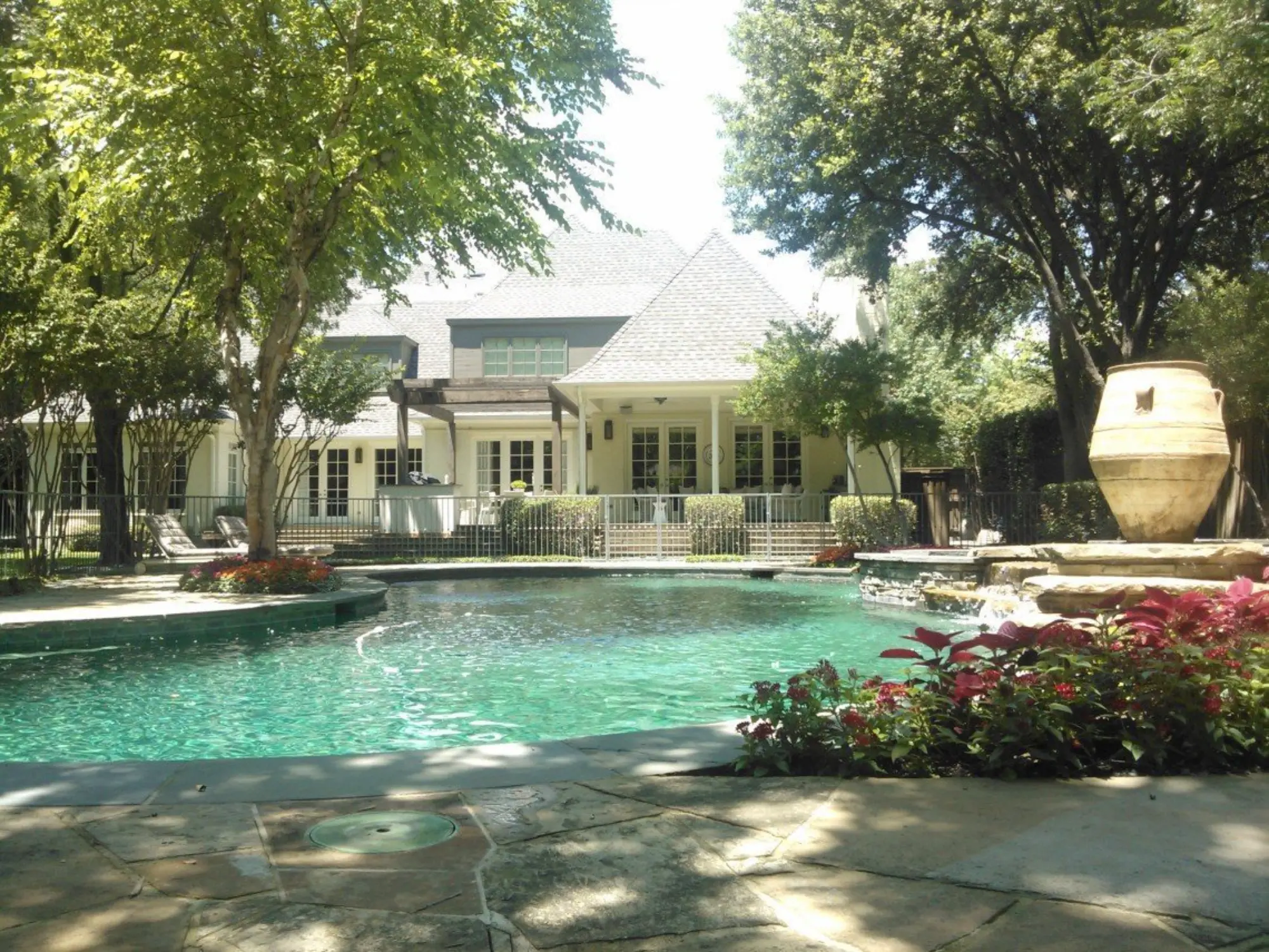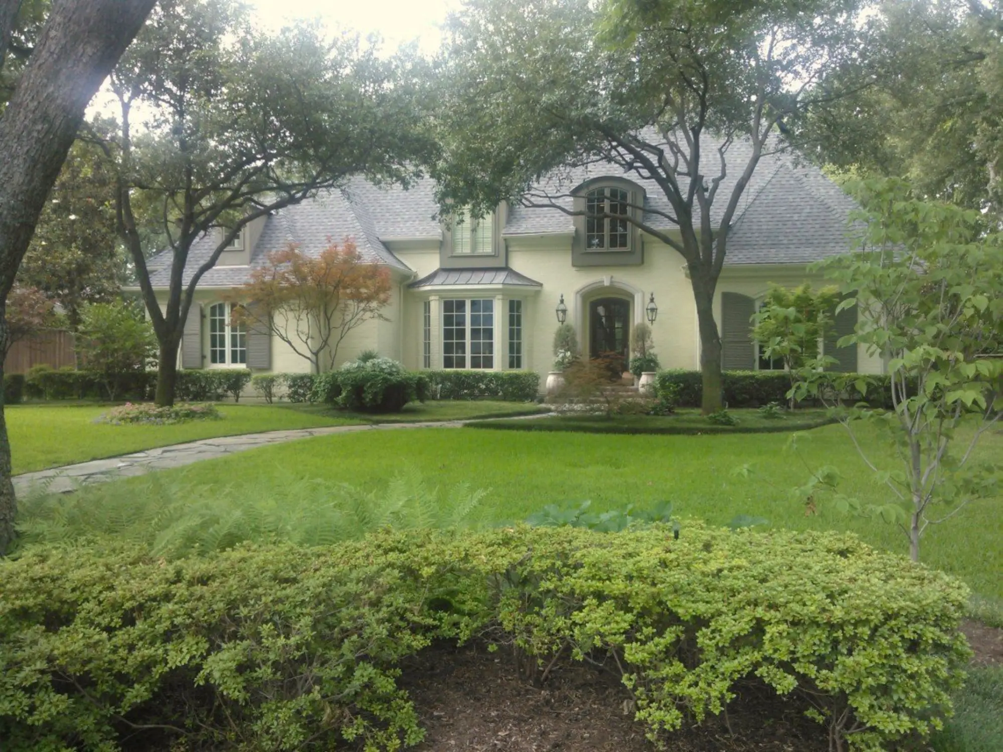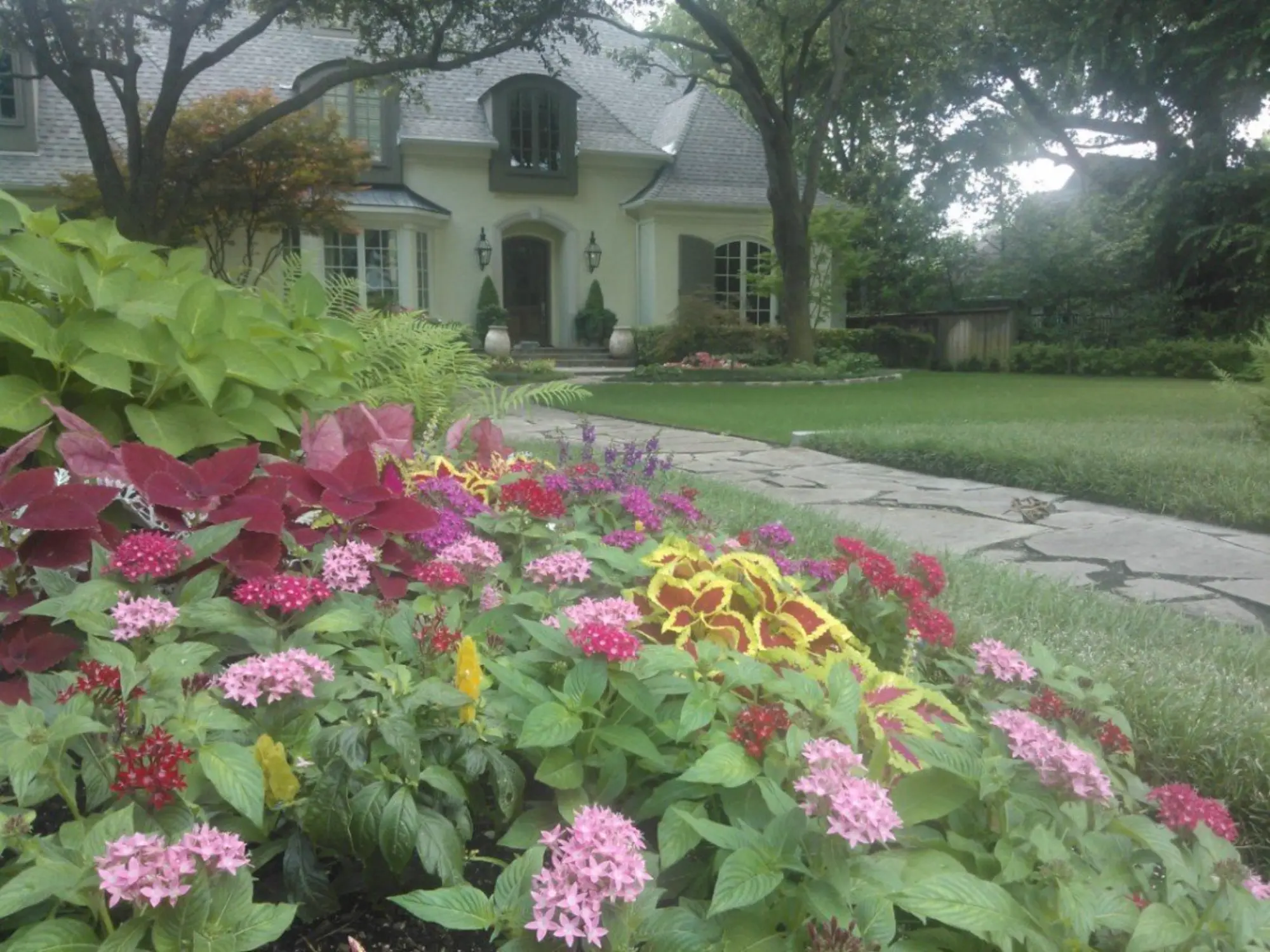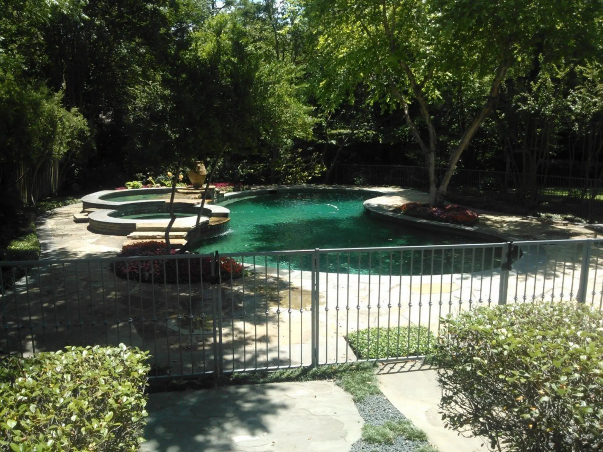 This chateau style home has stunning European flair! We complimented the European feel with larger garden beds that could be filled with lots of lush color. In order to work with the established shade trees, we planted Japanese maples and azaleas; both are showy in the shade. The quaint iron fence is a wonderful frame for the front beds, which we filled with both perennials and seasonal color. In spring, tulips bloom big alongside the azaleas. Come summer, caladiums and impatiens rule supreme! Guests are welcomed at the front gate by a natural stone pad. The shaded pool is given the same beautiful treatment as the front landscape to offer a continuous flow.