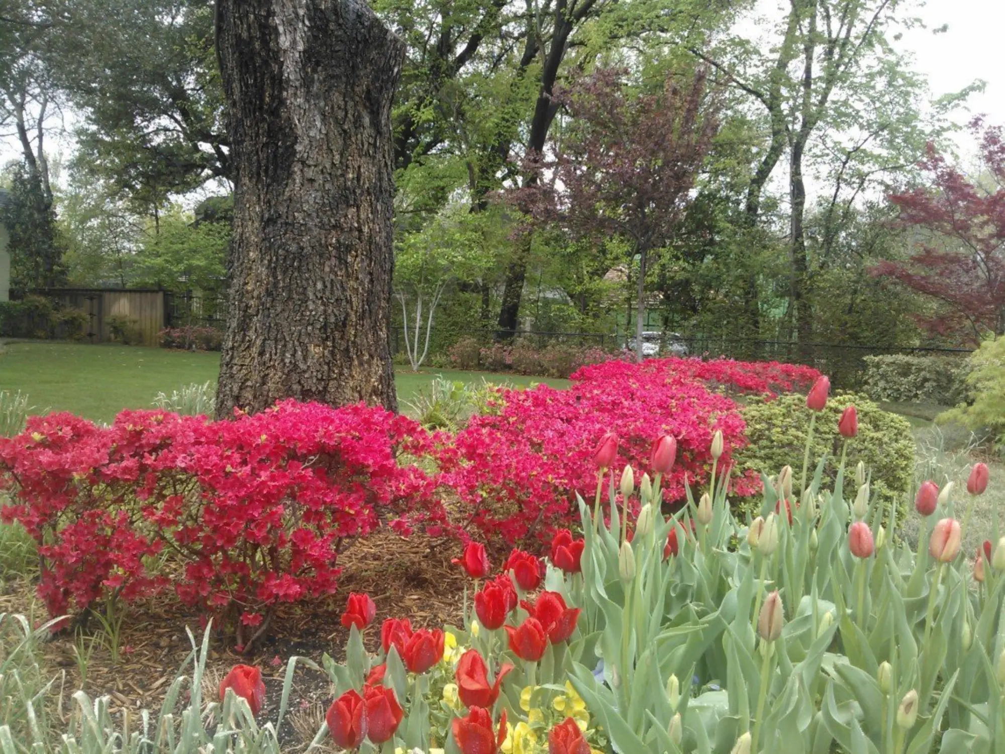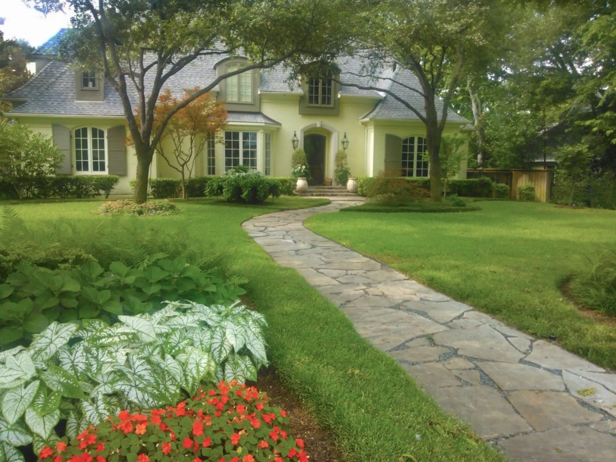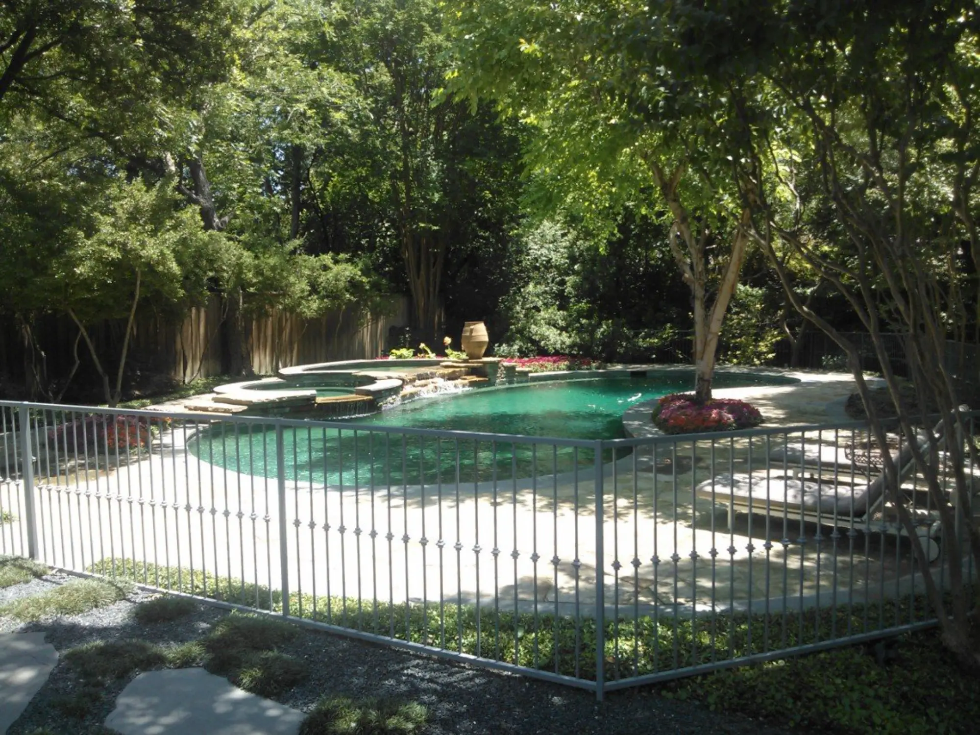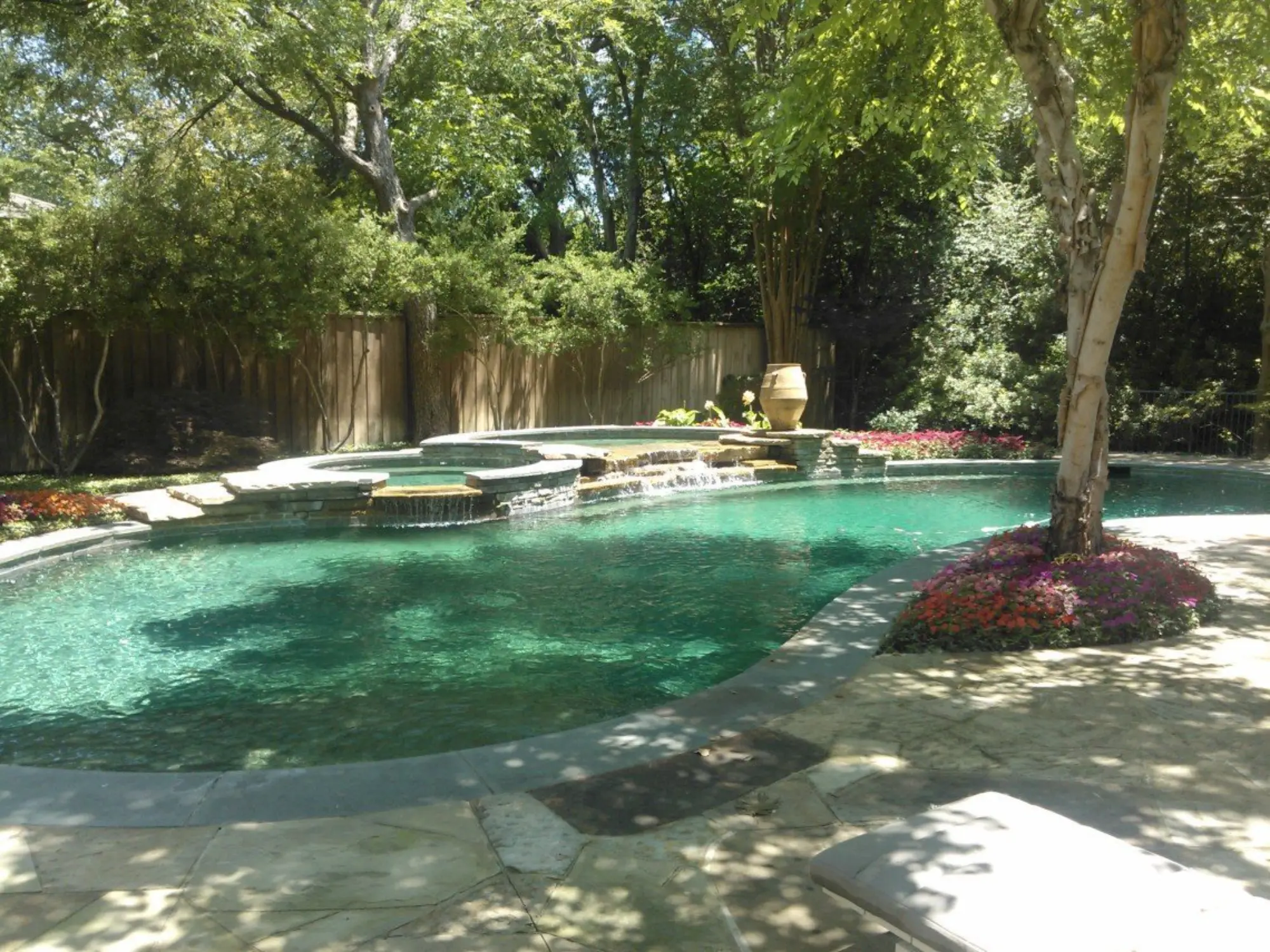 This chateau style home has stunning European flair! We complimented the European feel with larger garden beds that could be filled with lots of lush color. In order to work with the established shade trees, we planted Japanese maples and azaleas; both are showy in the shade. The quaint iron fence is a wonderful frame for the front beds, which we filled with both perennials and seasonal color. In spring, tulips bloom big alongside the azaleas. Come summer, caladiums and impatiens rule supreme! Guests are welcomed at the front gate by a natural stone pad. The shaded pool is given the same beautiful treatment as the front landscape to offer a continuous flow.